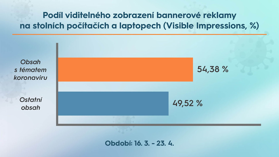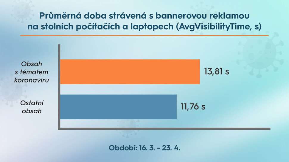 Na stolních počítačích a laptopech byla reklama na stránkách s tématem koronaviru oproti stránkám bez tohoto tématu o 10 procent viditelnější (Visible Impressions), uživatelé s ní strávili o více než 17 procent déle času a dosáhla o téměř 21 procent vyšší proklikovosti.
