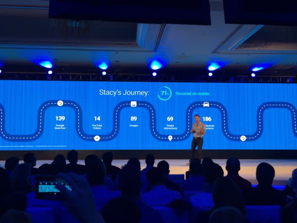 Jeden z prezentovaných příkladů ilustroval počet a druh interakcí na internetu a mobilním telefonu, které učinila matka 2 dětí Stacy během rozhodovacího procesu při nákupu nového automobilu. Je jich několik set a 71 % z nich se odehrálo na mobilu. Tak dnes běžně probíhá nákupní rozhodování spotřebitelů.