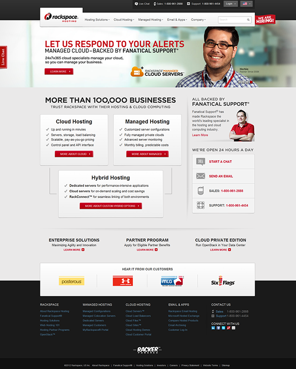 Titulní stránka webu společnosti Rackspace, poskytovatele cloudové infrastruktury, velmi dobře ilustruje trendy v tvorbě nejmodernějších webů – dobře provedená konverzní architektura a prvky, které budují důvěryhodnost – představitelé firmy, reference a loga zákazníků apod.