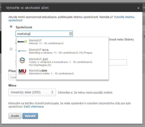 Nahoře v liště je duplicitně nastavena inzerce pod vaším jménem (individuální). Nyní je potřeba vytvořit obchodní účet pro inzerci na LinkedIn