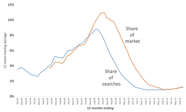 I tato data je možné ze Share of Search ukazatele vyčíst. V dlouhodobém horizontu u našich klientů pozorujeme, že růstu podílu na trhu (market share) předchází růst podílu značky ve vyhledávání.
